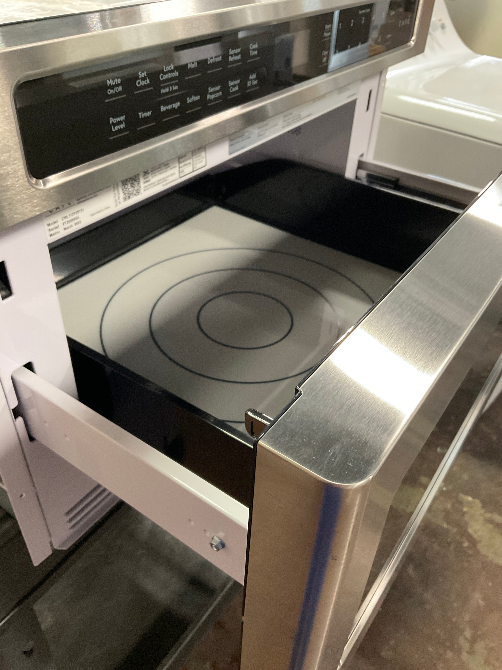• Simply push a button to open the handleless microwave door.